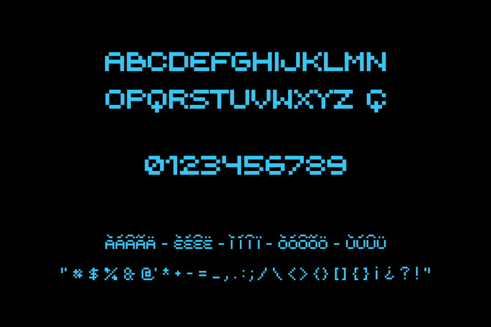 Pixes is an ideal pixel art font in applications such as games, posters, stickers and wherever else your creativity allows. Contains Latin accents included and webfont version.